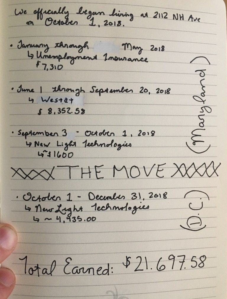 In doing our taxes, I had to measure out the amount of money I made during our time in Silver Spring last year vs our time in our new apartment here in DC. It really hit home in crunching those numbers just how much I lost last year. (See pic below.)