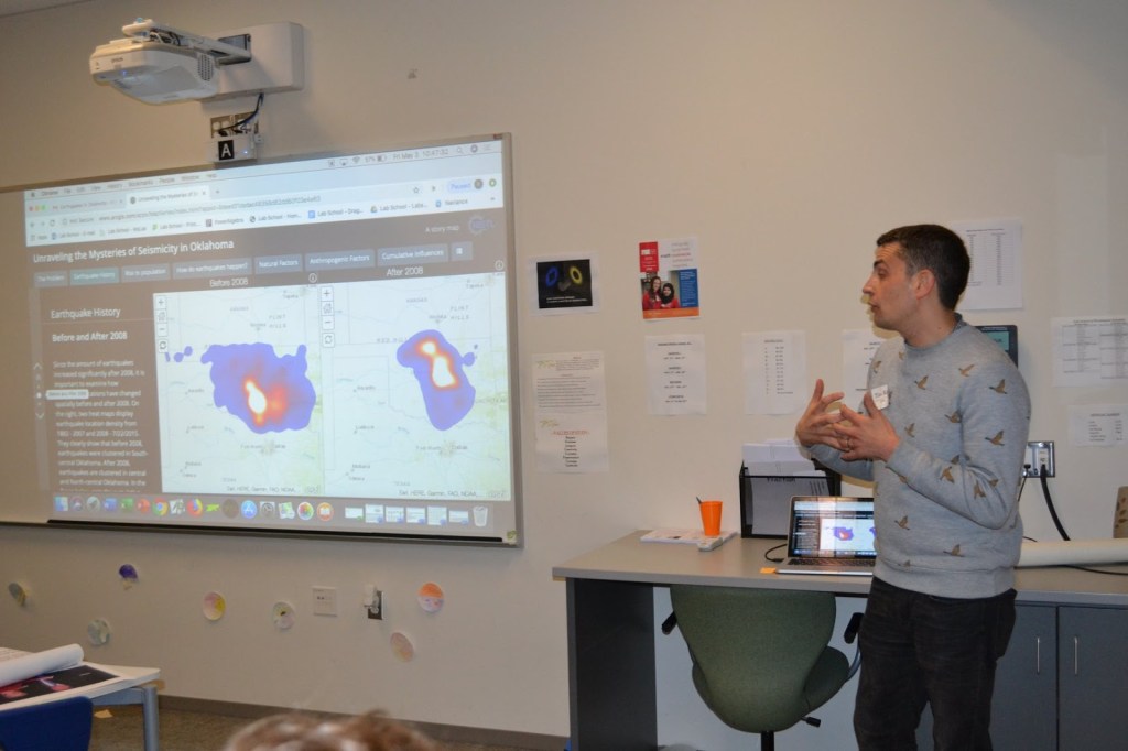 The students heard about the company’s work making disaster-response maps for clients such as the Federal Emergency Management Administration (FEMA); the company’s work in remote sensing analysis of satellite imagery; and their development of innovative new tools to better visualize and understand the world.