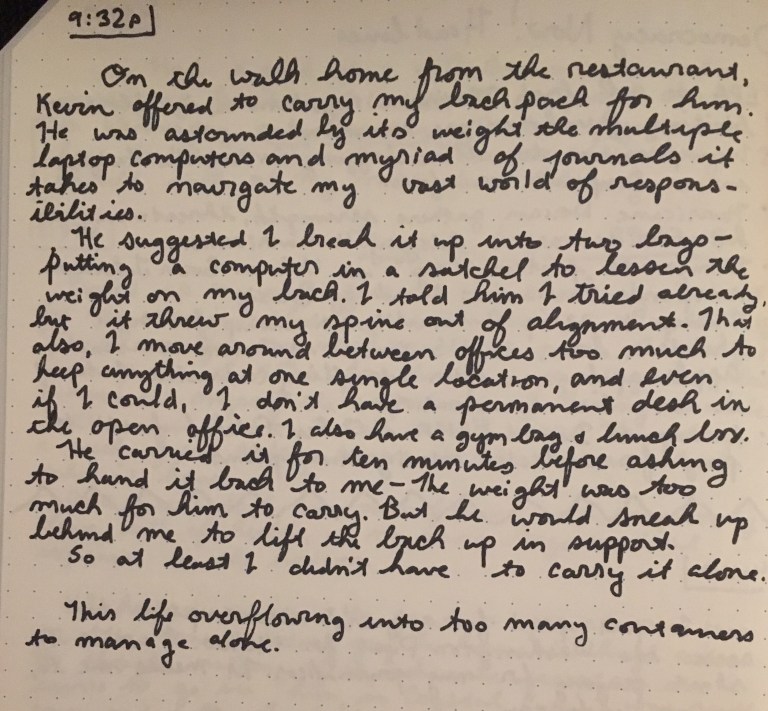 This life overflowing into too many containers to manage alone.